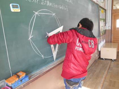 正六角形の性質を想起し,この方法で正六角形を作図できるわけを考えながら作図することができました。