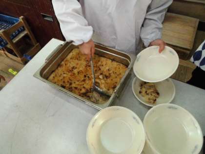 今日は新献立の「ペンネの豆乳グラタン」でした。初めてのグラタンに,食べる前から「おいしそう!」という声がたくさん聞こえました。上手に取り分けることもでき,おかわりをする児童もたくさん見られました。また,今日は「野菜のスープ煮」にハッピーキャロット(星型の人参)が各クラスに数個ずつ入っており,入っていた児童には給食調理員さんから,しおりのプレゼントがありました。