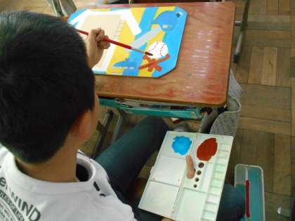 電動糸のこぎりで切り出した形をやすりで整え,自分の思いやイメージに合うように色を着けています。