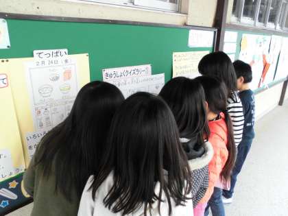 また,昨日から給食委員会による給食クイズラリーが行われています。答えを相談しながら解いている姿がたくさん見られました。
