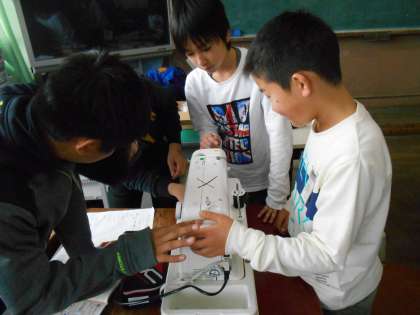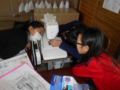 糸を掛ける場所や下糸の準備,ボビンを入れる場所など,お友だちと声を掛け合い,どきどきしながら進めていました。