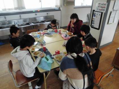 「給食時間内に食べ切る」ことは全員もちろんのこと,他にも,「三角食べをする」,「汁ものを飲むときはお箸やスプーンを置く」,「パンなどは細かくちぎって食べる」など様々なことを毎日の献立の中で学習しています。