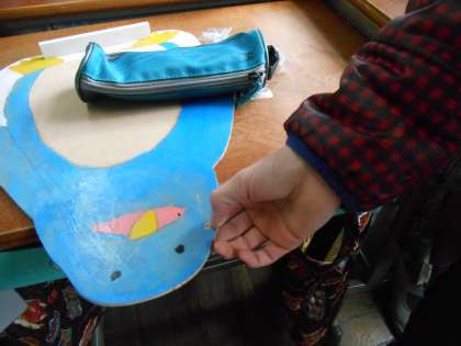 フックを付ける小さな板にも,ボンドだけでなく,釘を打って補強しています。