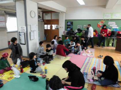鏡山小学校の子どもたちからは,ハンドベルの演奏と,「グーチョキパーで何作ろう」を全体の前で発表しました。
