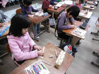 今日の2時間目の体育はあいにくの雨で中止となったため,その時間を使って卒業のお祝いを折り紙で作りました。