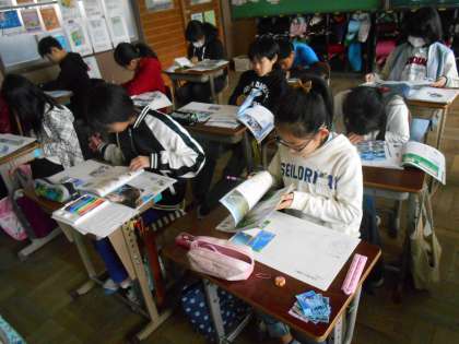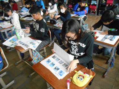前回に引き続き1年間の学習のふり返りを,教科書やノート,写真カードを使って行っています。