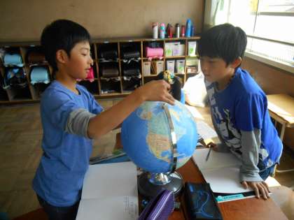 世界の主な大陸と海洋の名称について地球儀を使って調べました。