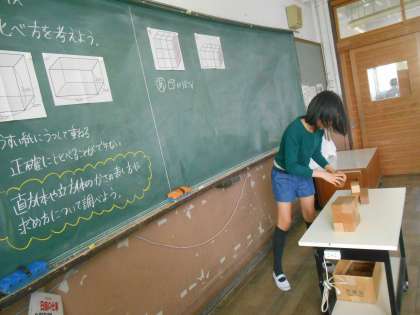 1辺が1cm立方体を実際にさわってみながら,体積の表し方と体積の単位の1立方センチメートルについて確認し,それを用いて直方体の体積として表すことができました。