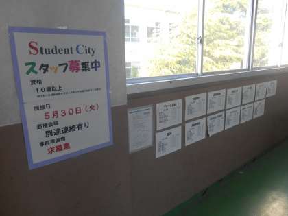スチューデントシティ学習に向けて,5年生の教室前廊下に求人票をはりだしました。