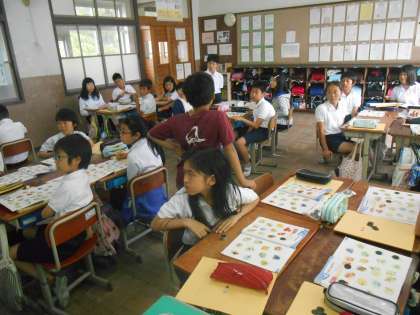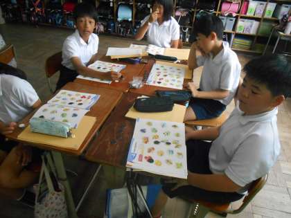 食べ物やスポーツなどを表す表現を繰り返し発音したり,覚えたての英単語を使っておはじきゲームをしたりしました。