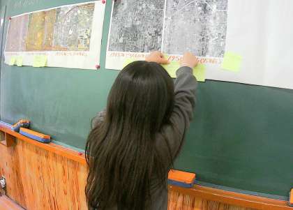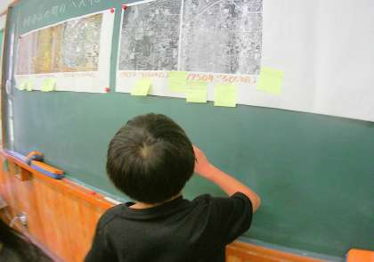 「昔は鏡山も畑や田んぼばっかりだった。」という内海さんのお話から、昔の航空写真を見て調べました。本当に田んぼや畑が住宅にかわっていったことが分かりました。