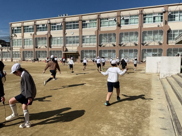 縄跳びでは、交差跳びやあや跳び、二十跳びなどに挑戦しています。自己ベストを記録した子どももいました。