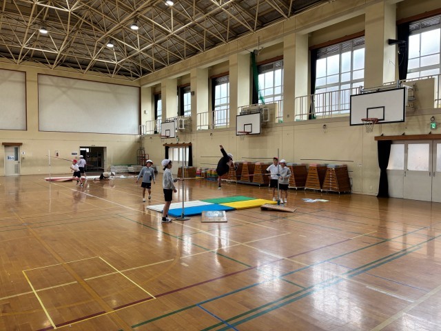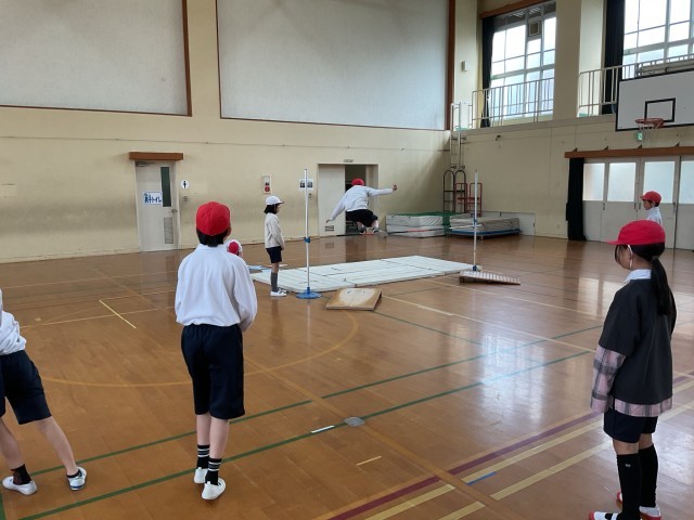 体育の学習「高跳び」では、自己ベストを出せるよう取り組んでいます。自分の目安となる記録を超えられるよう、助走や踏み切り、空中動作などを工夫しながら頑張っていました。