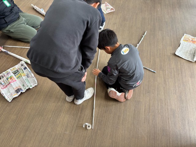 図工の学習で、新聞紙やチラシを使って棒をつくり、つなげたり組み立てたりしました。グループで面白い形に組み立てることができました。