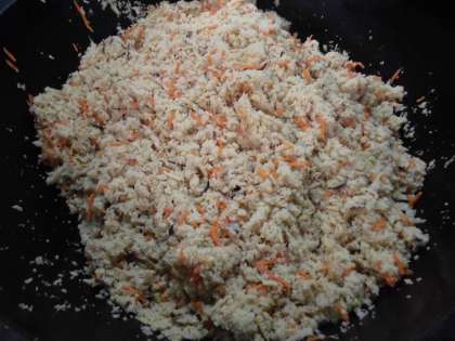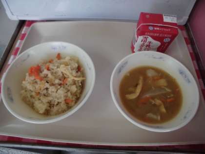 給食では、チキンささみ、たけのこ、乾燥にんじん、しいたけなどの具を加えて、給食室の釜で炊きました。