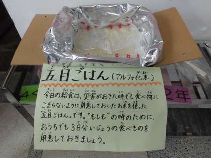 今日の五目ごはんは、京都市で災害用に備蓄してある「アルファ化米」を使いました。