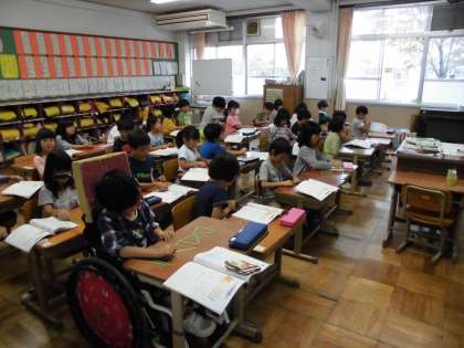 1年生の算数では今「かたちづくり」の学習に取り組んでいます。色板を並べて色んな形を作ったり,形に必要な色板を数えたりしています。また,数え棒でも色々な形づくりをしています。先生が「棒で8を作ってみましょう!」と投げかけると,みんな一生懸命並べ始めます。「できた!!」と嬉しそうに次々と手を挙げている1年生です。「8の形は棒を何本使ったのかな?」と学習は進んでいきました。算数は楽しいね!