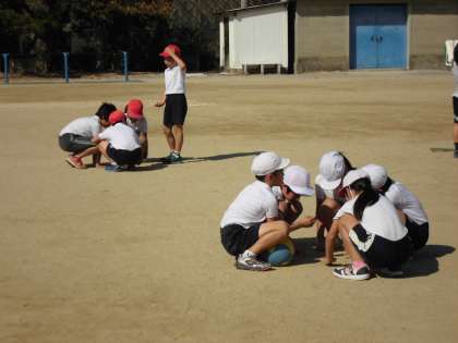 今日の体育はエンドボールです。秋晴れの空のもと,元気に走り回る子どもたちです。パスがうまく通って,ゴール近くに迫り“シュート”。そこには,守りの達人ガードマンがいて,見事にシュートをガードしました。「ナイスガード!」と味方からの声がかかります。得点するために作戦タイムも真剣です。