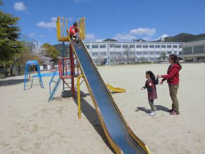 とってもいい天気なので,運動場の『春みつけ』をしました。桜の花やゆきやなぎの花,校庭には春がいっぱいです。いろんな遊具にもチャレンジしてみました。二人とも大きな滑り台を楽しそうに滑ることができました。明日はどんな春が見つかるかな?