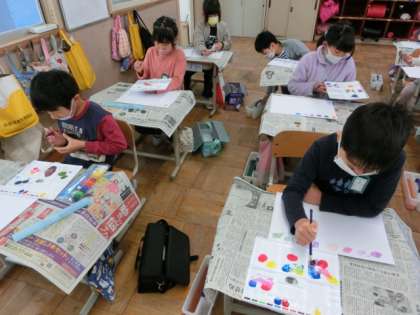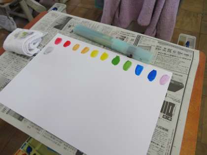 今日は図工で絵の具を使いました。「赤・青・黄」の3色だけを使ってたくさんの色を作りました。「3色しかないのにこんなにたくさん色ができるんだ!」,「きれいな色ができたよ」と楽しく活動する姿が見られました。これから絵の具を使って学習していけるのが楽しみですね!