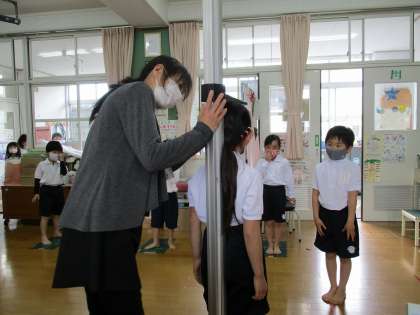 今日は,身体計測で身長と体重を測りました。学校では,身体計測の時は体操服を着て測定します。身長計・体重計に上手にのって測定できました。