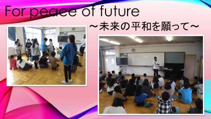 総合の学習が始まりました。「For peace of future 〜生きてこそ〜というタイトルで学習しています。訳すと,「未来の平和を願って」です。未来の平和のために自分たちに何ができるのか?と考えていきます。今日はウェイピングマップを使って「平和」について考えを深めました。