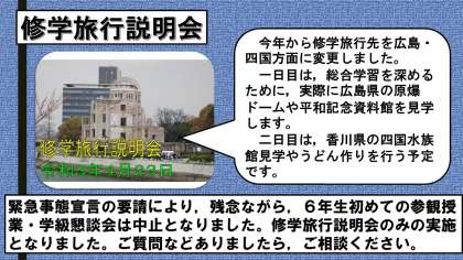 今日は,6年生の初めての参観授業・学級懇談会の予定でしたが,緊急事態宣言の要請を受け,急遽,中止となりました。