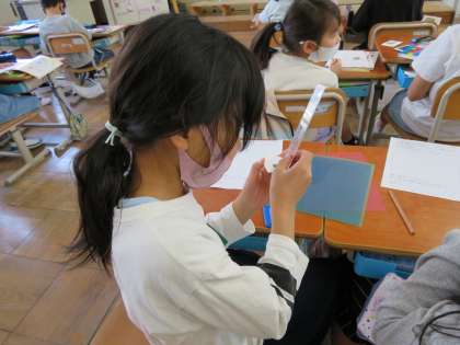 理科ではモンシロチョウのたまごを観察しました。葉っぱについた小さな小さなたまごを虫めがねでよく見て絵をかきました。これからどんな風に大きくなっていくのかな?楽しみですね!