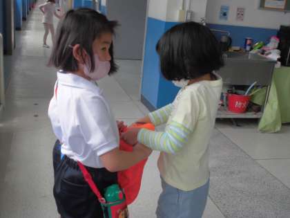 中間休み,ビブスが落ちそうになっていたので,さっとやさしく助けることができる2年生。そして,助けてもらって,自然と「ありがとう。」と言える1年生。どちらも心があたたかくなる姿だったので,思わず写真を撮りました。
