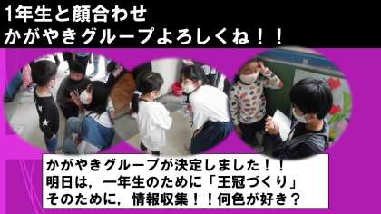 1年生との顔合せでは,「リーダーの〇〇です。よろしくね。」と自己紹介し,1年生にお祝いで渡す王冠づくりのために,「何色が好き?」「好きなものは?」など,質問しながら,情報収集をしていました。