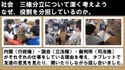 社会では,三権分立についてそれぞれの考えをカードに書いて,提出ボックスに提出すると,全員で共有することができます。一人一人の考えを読みながら,自分の考えと比較し,さらに自分の考えを深めていました。