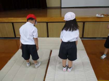 手を振って,「いち,にの,さんっ!」と大きく跳び,飛んだ長さを測りました。