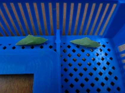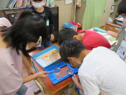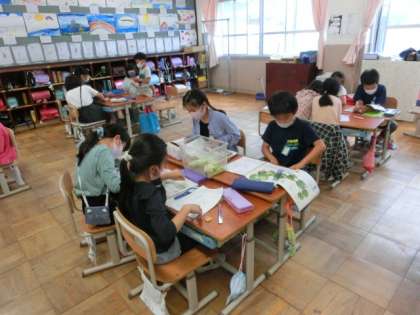 理科の学習「こん虫の育ち方」で,モンシロチョウの幼虫がさなぎになりました。飼育ケースの側面や蓋の裏側でたくさん見つかりました。うすい黄緑やうすい茶色をしていてうごきません。中がすけて見えるものも・・・モンシロチョウがたくさん生まれそうで,楽しみです。