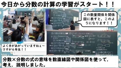 今日は,分数×分数の式の意味を数直線図や関係図を使って考え,説明しました。
