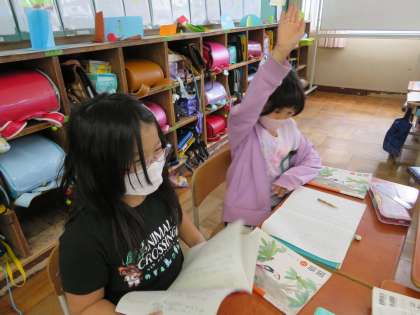 国語科の「もっと知りたい,友だちのこと」の学習で友だちの話を聞いて,感想を言ったり質問をしたりしています。