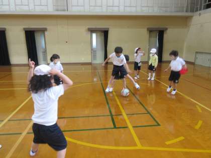 そのあと,体育館で転がしドッジをしました。逃げるのも転がすのも上手になってきました!