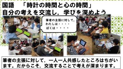 国語の学習では,「時計の時間と心の時間」の筆者の主張に対して,自分が考えたことを交流し,さらに考えを深める学習をしました。グループでいつもより感覚を取り,自分の考えを話し,メモしながら聴き合いました。