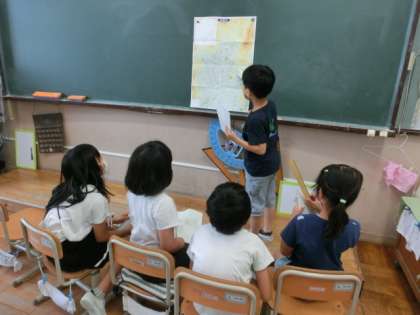 私たちが暮らす京都市が,どんなまちなのか調べました。自分が調べた所が陵ヶ岡小学校から見てどちらの方角にあるか,地図を使いながら発表しました。「山にかこまれたところ」や「工場の多いところ」など,調べていない友達に伝えました。分からないところは,質問して聞いて教えてもらいました。