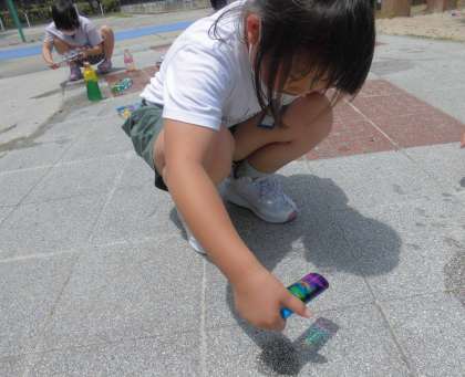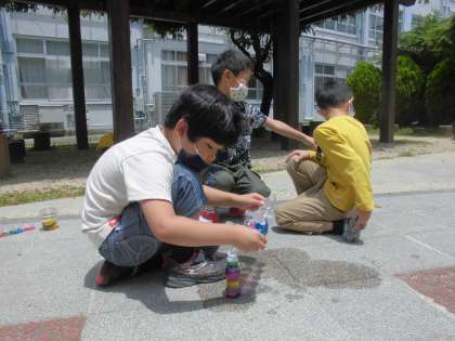 先週からつくっていた,図工〜ひかりのプレゼント〜の作品を,外にもっていき,太陽の光をあてて,色がうつる楽しさを感じ取ることができました。「こっちに向けると青色が見える」,「近づけると色が濃く見える」など,実際に光をあてることで,様々な発見をすることができました。材料等のご協力ありがとうございました。