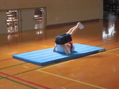 体育で,マットあそびをしました。まえまわり,うしろまわり,丸太転がりなど,自分のできる遊びに挑戦しました。どんな技があるのか,学習カードを見ながら,いろいろな技に取り組むことができました。