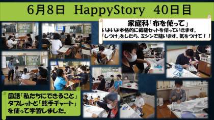 家庭科では,本格的な作業に入りました。「しつけ」を行いました。そろそろ「ミシン」に行く子たちも出てくるかな?