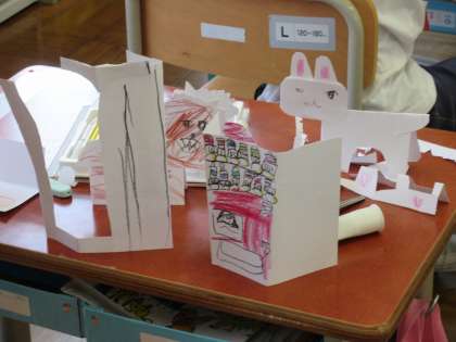 今日の図工では,紙を折って立てて,切ったり描いたりしながら,作りたいものを作りました。「動物園」「海」「遊園地」「まち」など,各グループでテーマを決めて作りました。