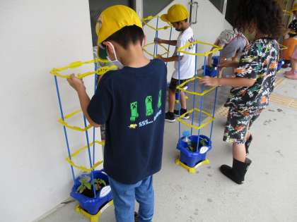 みんなの体の半分以上ある支柱を立てるのは,難しいかなと思っていましたが,みんな上手に鉢にさして立てることができました!