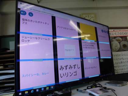 タブレットを使っておいしさを表現する言葉と料理の組み合わせを考えると,「アツアツのコーンスープ」「みずみずしいりんご」「スパイシーなカレー」「シャキシャキしたサラダ」と,たくさんのおいしそうな言葉が並びました。