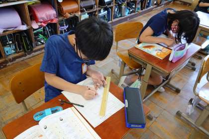 長方形や正方形は4本の直線で囲まれていなければなりません。そのため,線と線をしっかりくっつけることに気を付けながらかきました。かいていると三角定規がずれてしまうことがあったので,ずれないようにしっかりおさえることが大事だとみんなで確かめました。