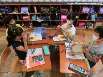 1回目の今日は「楽器を鳴らしてみてどんなことが分かるかな」と考えました。タンバリンやトライアングルなどを鳴らしてみると「楽器がふるえているね。」「一回たたくと音が響いてだんだん小さくなる。」などさまざまなことに気付いていました。