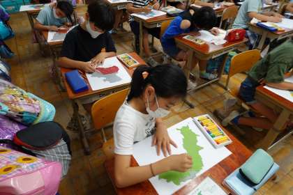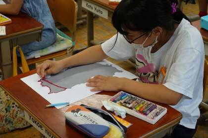 今日は,雨で水泳学習ができなかったため,ミュージックデイに向けての準備をしました。ミュージックデイでは都道府県の覚え歌を発表する予定なので,今日は都道府県の形から何に見えるかを想像して絵に表しました。