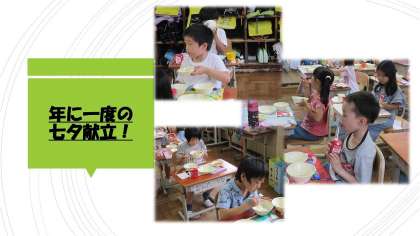 今日の給食では,「七夕そうめん」が出ました。一年に一度しかない献立ということで,給食時間になる前から「絶対ぺろりんするぞ!」と意気込んでいる様子が見られました。「七夕そうめん」の他にも「かぼちゃの煮つけ」は甘くておいしく,すぐに完売!口をしっかり動かしていつも以上に食べることができた一日となりました。