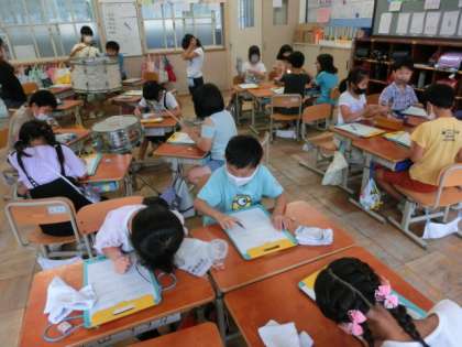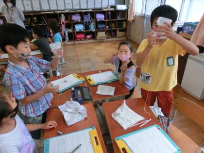 今日は「音の大きさがかわると,もののふるえかたはどのようにかわるのか。」という実験をしました。大太鼓や小太鼓や音叉。カップにビーズを入れてひもを付けたもの。箱にゴムをかけたもの。それらをたたいたり,こすったり,はじいたりして音を出して,小さい音の時と大きい音の時と比べてみました。目の前でビーズが飛び跳ねるたびに大きな声を出していました。大太鼓は耳をおえる子もいました。体でものの震えを感じてくれたようです。