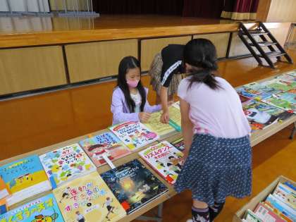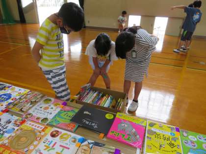 たくさんある本の中から図書館に入ったらいいなと思う本を一人一冊選びます。「迷うなあ。」「これもこれもいいな。」とたくさん本を眺めては悩んでいる姿が見られました。